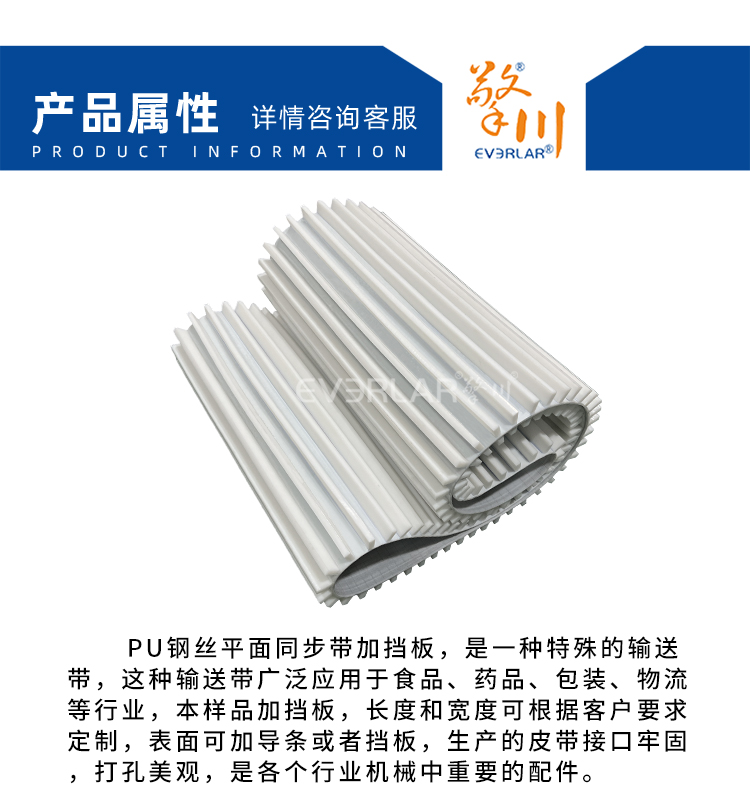 產(chǎn)品名稱:白色聚氨酯鋼絲平面同步帶加擋板物流包裝耐磨耐油PU傳動帶工業(yè)皮帶